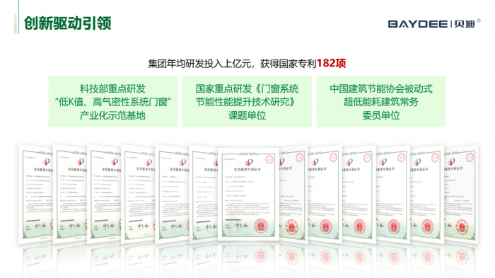 貝迪始終秉持自主研發(fā)與產(chǎn)學(xué)研相結(jié)合,與國內(nèi)知名企業(yè)、高校合作,打造產(chǎn)學(xué)研平臺吸引聚集人才,以科技人才帶動優(yōu)勢項目,推動了產(chǎn)業(yè)轉(zhuǎn)型升級和自主創(chuàng)新的良性互動。目前,貝迪已建立起國家級、省部級高性能門窗產(chǎn)品研發(fā)平臺,擁有多項型材及門窗行業(yè)國家專利。在標(biāo)準(zhǔn)制定方面,貝迪參與起草制定多項國家級行業(yè)標(biāo)準(zhǔn),是行業(yè)內(nèi)主要起草、參與起草較多的企業(yè),為節(jié)能門窗行業(yè)標(biāo)準(zhǔn)制定作出貢獻。
